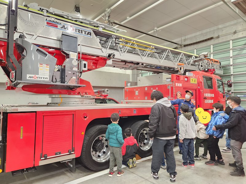 まずは、外に並んだ消防車両へ導かれ、車内の装備や役割について教えていただきました。