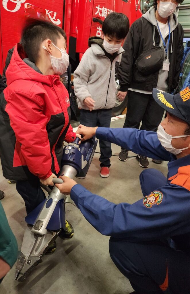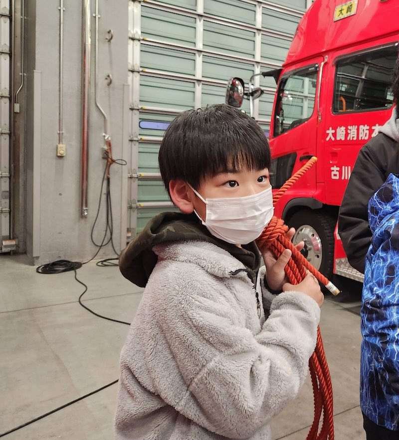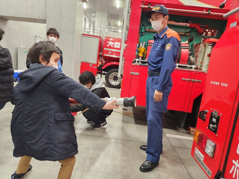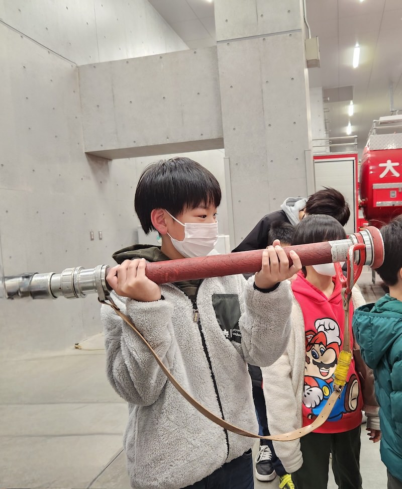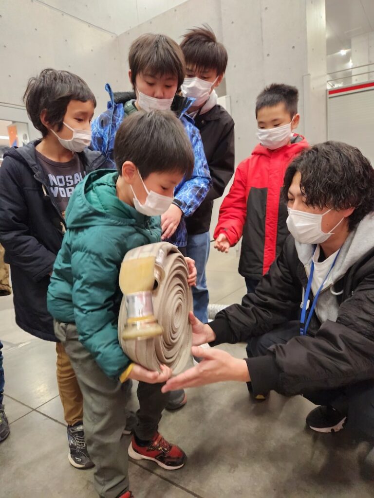 ホースや縄などの重さに驚き、「こんなのもってお仕事するの!?」と子どもたちからの驚きと尊敬の心境が一体感を生んでいます。