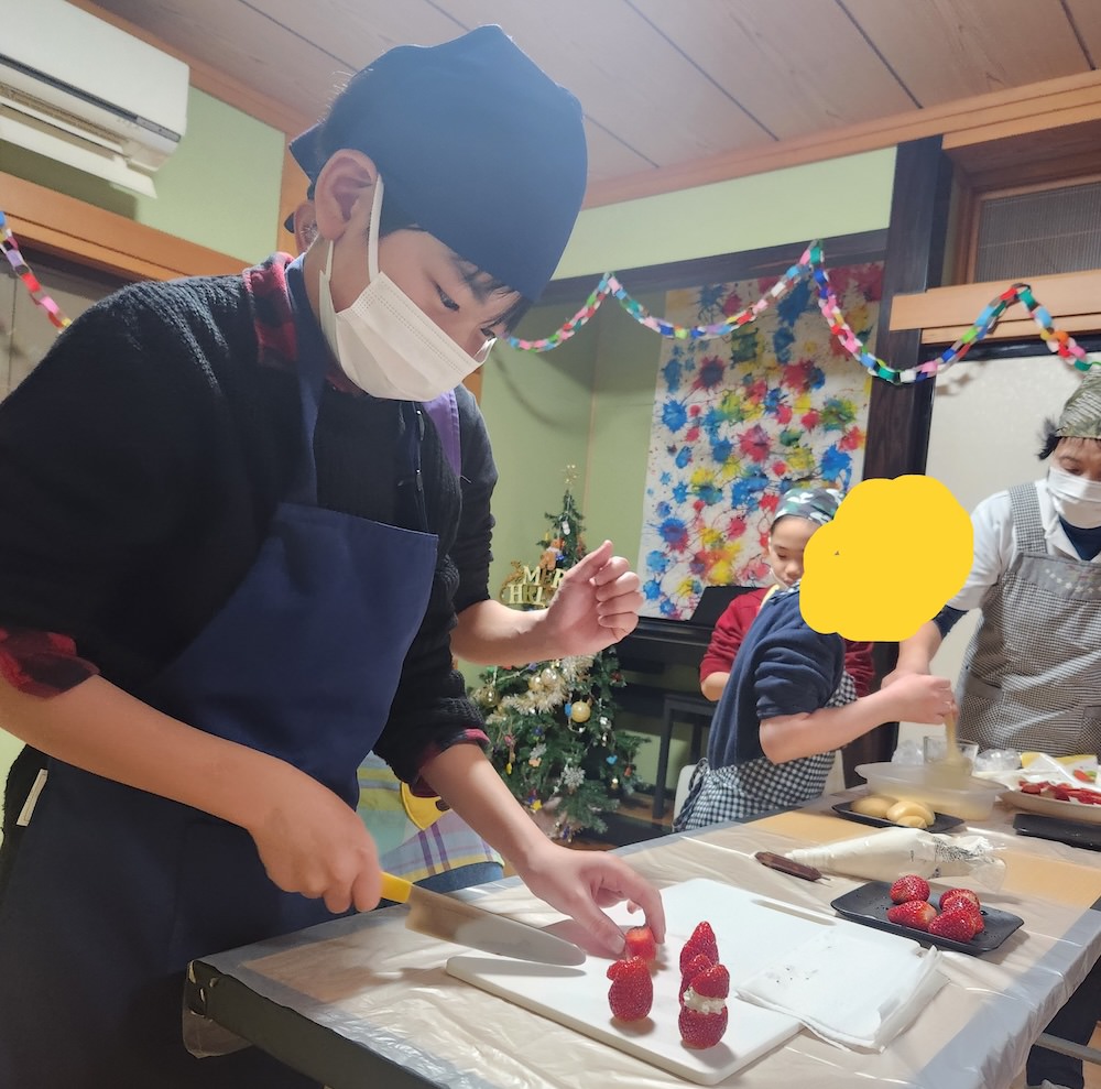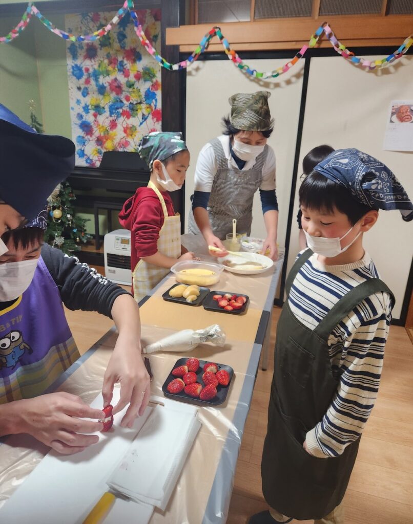 それぞれのケーキごとに子どもたちが分かれて工程を進める中で、子どもたちは自然と役割を見つけ、声を掛け合いながら作業を進めていきます。